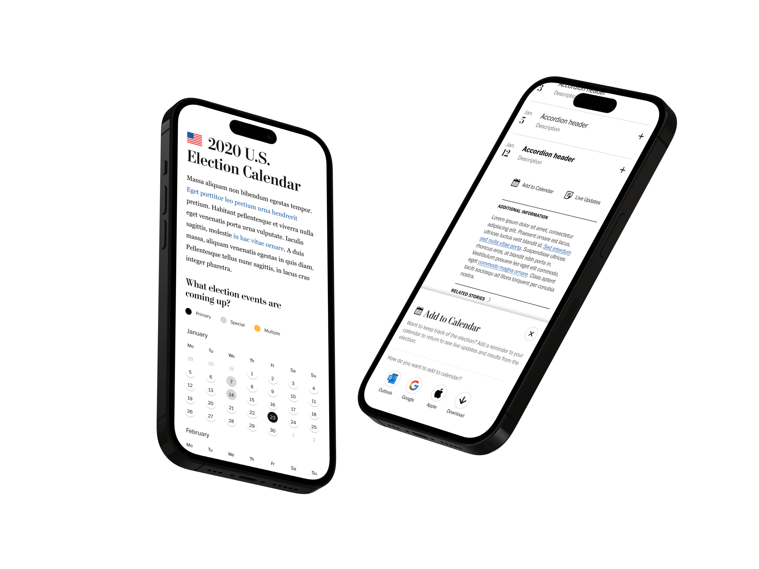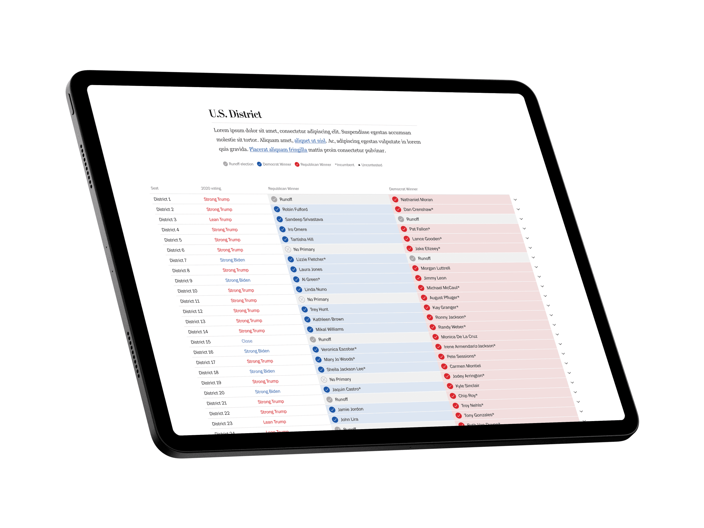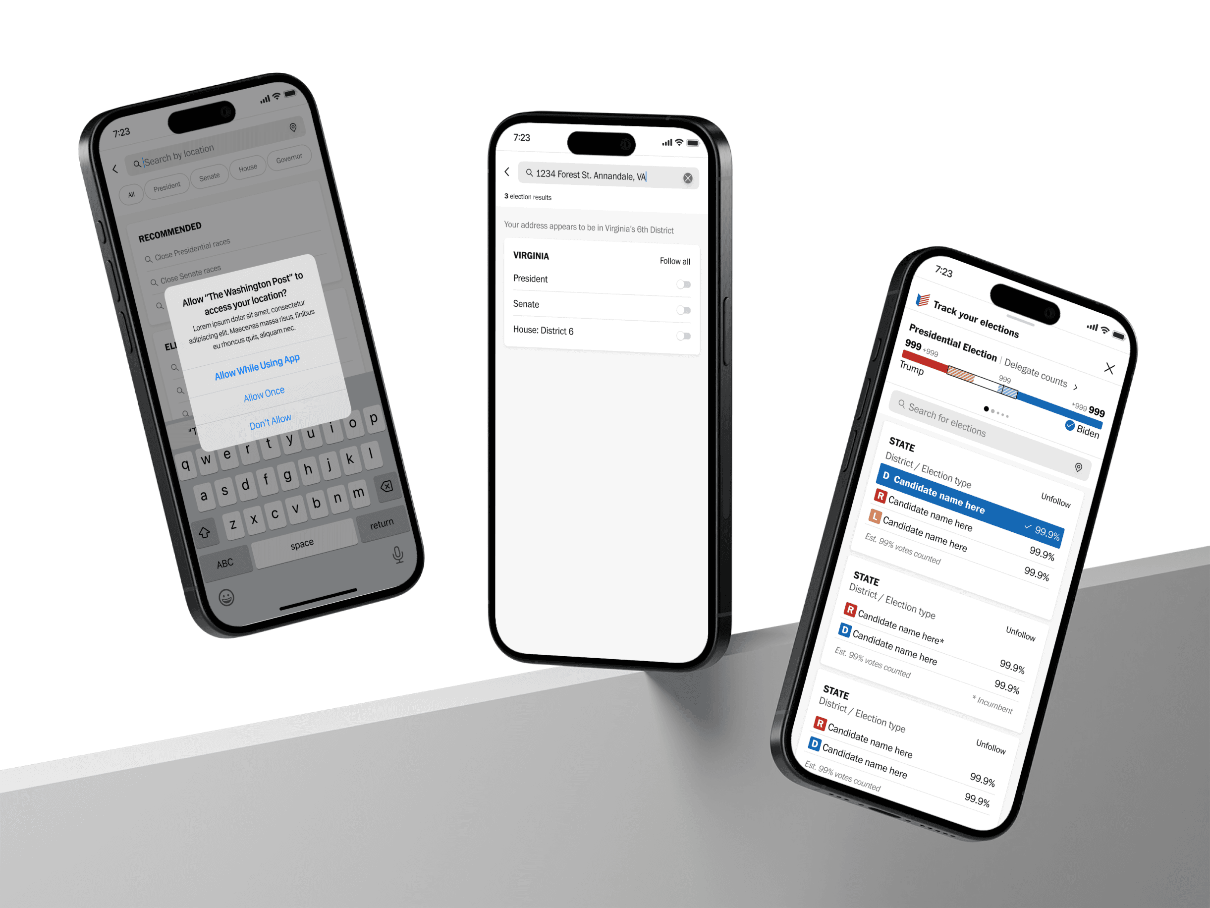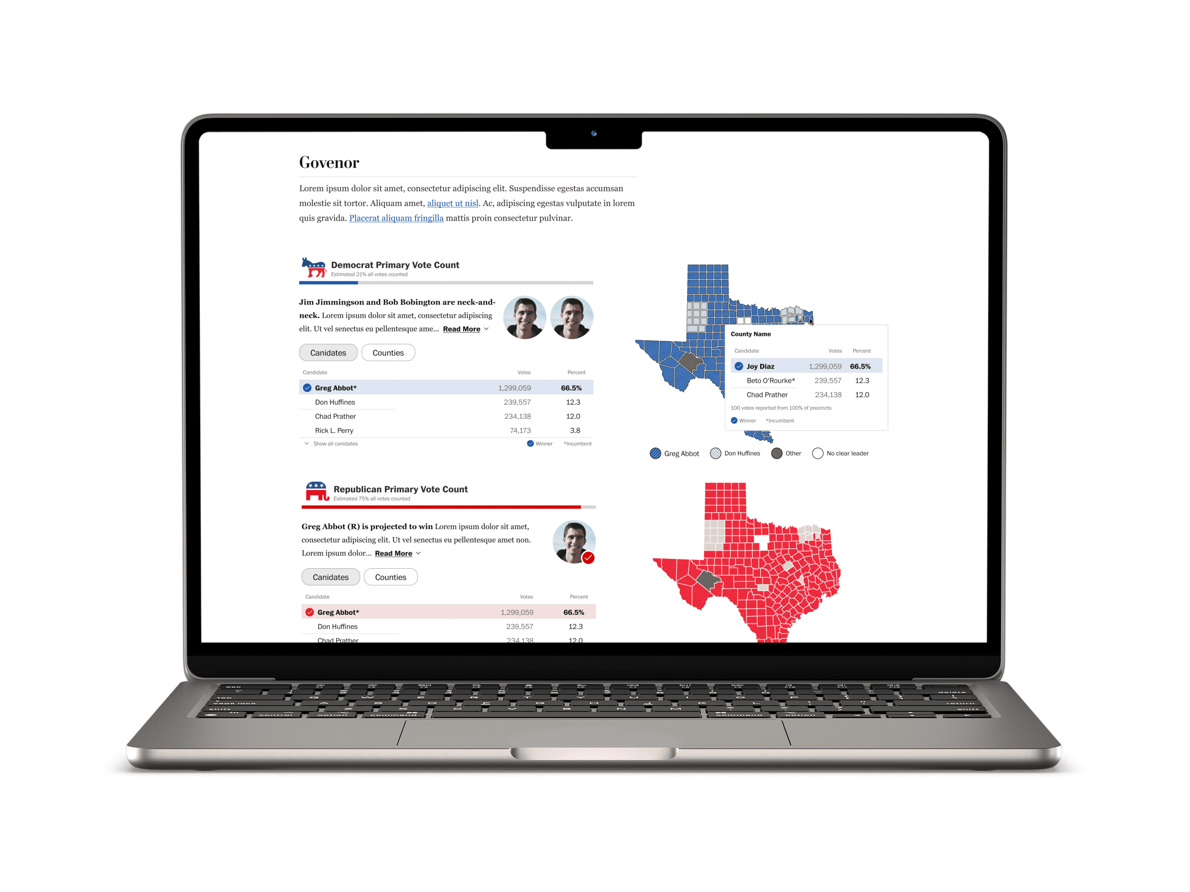 Working with the Washington Post's election team, I designed systems and features to enhance newsroom stories and provide readers with comprehensive election information at the local level while illustrating its impact on the national political landscape. Due to the nature of election coverage, projects involved rapid user testing and frequent feedback collection from election subject-matter experts.
