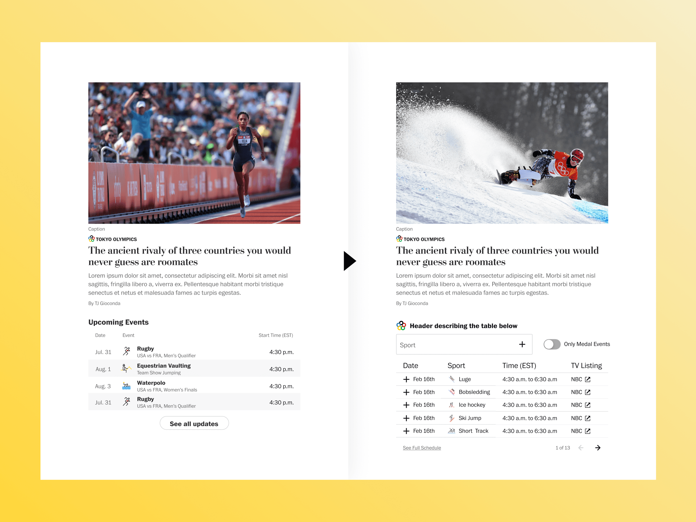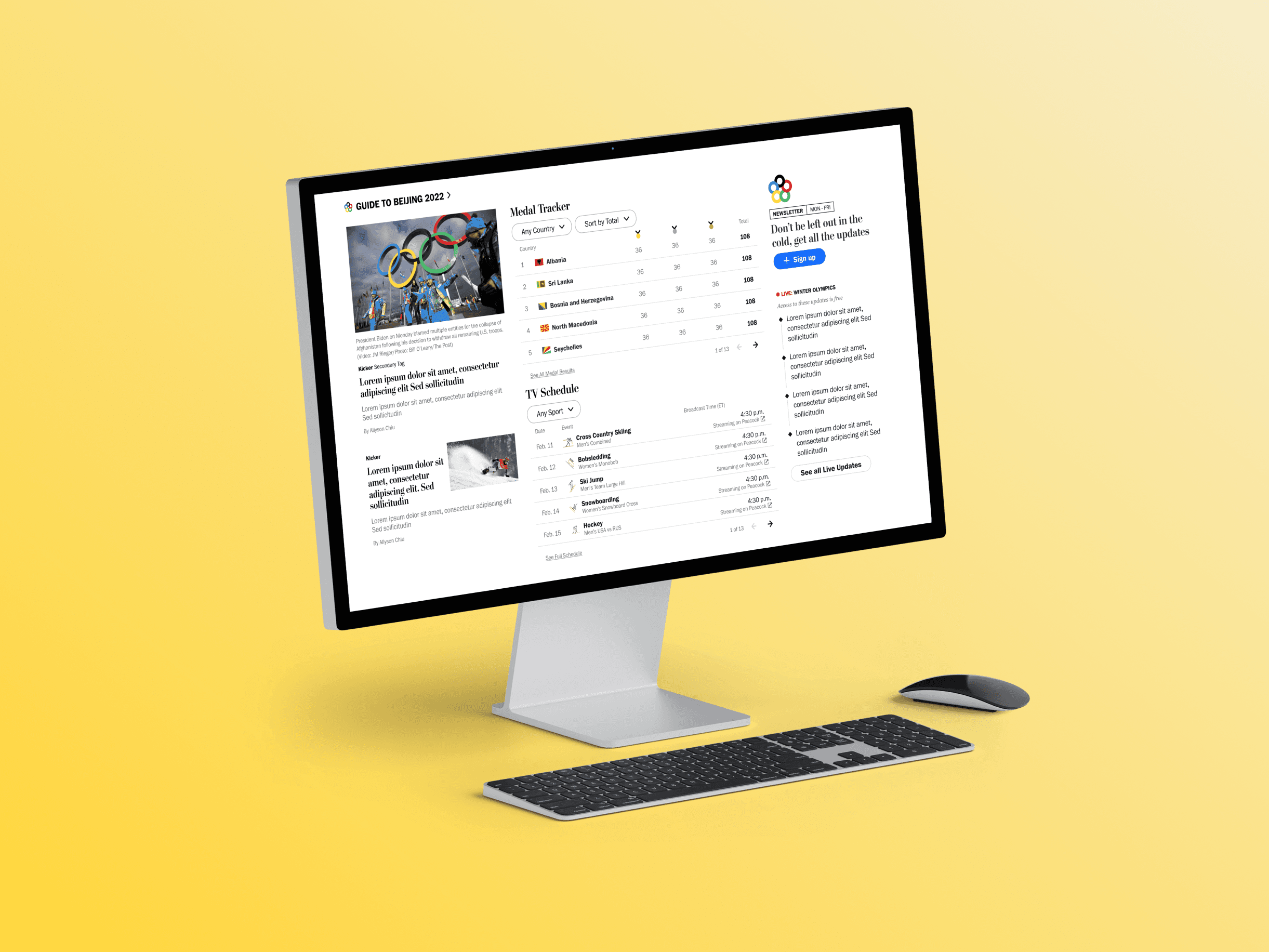 I developed a design system for the Olympics data visualization, covering both the Summer and Winter Olympics. The goal was to help users easily search for and follow various sports, TV schedules, and medal counts by country. This design system was created to be platform-agnostic, ensuring flexibility across mobile, tablet, desktop, and app products. It adapted to different screen sizes and reporting situations, and supported dark mode for a consistent user experience across all devices.
